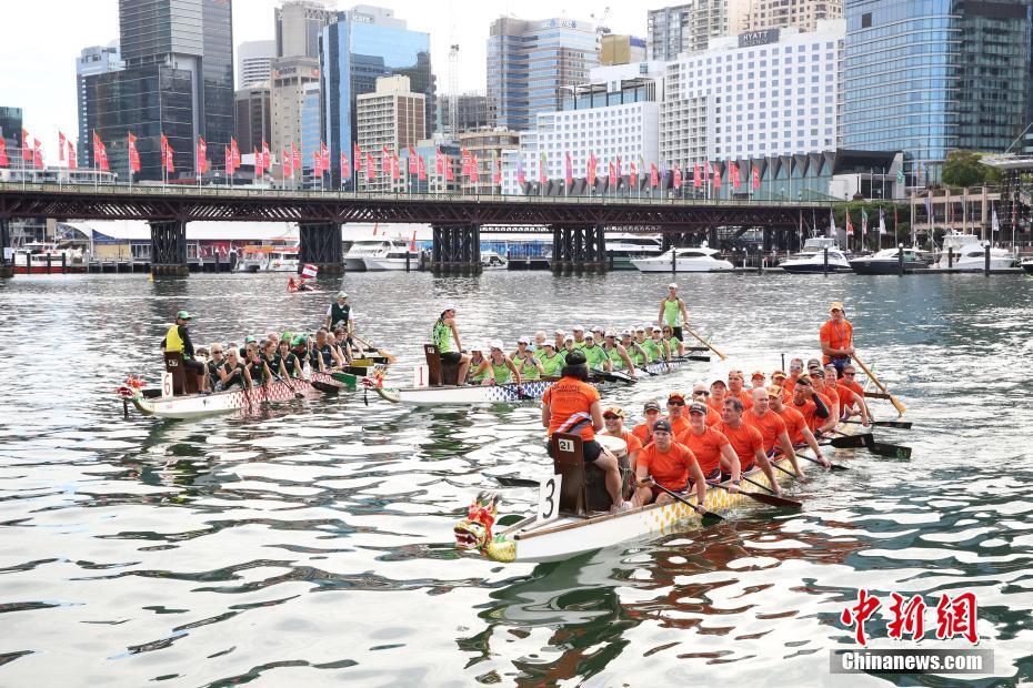 2月24日,悉尼达令港举行龙舟赛,吸引3000多名参赛者,为中国农历新年佳节添彩。图为参赛龙舟队在比赛中。​中新社记者 陶社兰 摄