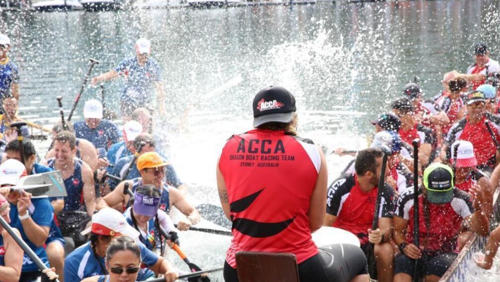 2月24日,悉尼达令港举行龙舟赛,吸引3000多名参赛者,为中国农历新年佳节添彩。图为参赛龙舟队在比赛中。 中新社记者 陶社兰 摄