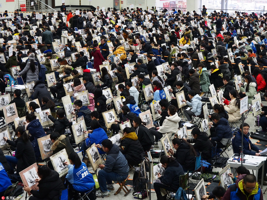 2018年2月24日早晨,济南舜耕国际会展中心,六千多名考生参加山东工艺美院举行的美术类专业入学考试。