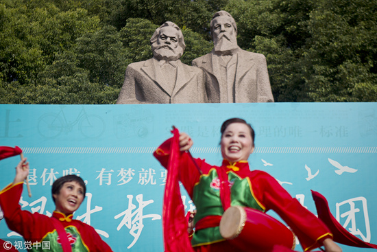 2013年10月20日,上海复兴公园,一支老年腰鼓队在马克思、恩格斯雕塑下表演