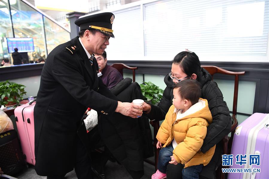 2月24日,刘明亮在合肥南站为旅客送上热水。今年50岁的刘明亮是中国铁路上海局集团有限公司合肥南站的一名客运值班员,工作20多年来,他热情、真诚地服务每一位需要帮助的旅客。2009年,刘明亮当选中国好人榜“敬业奉献好人”,次年他被授予全国劳模称号。现在,合肥南站有了以刘明亮命名的劳模工作室。春运期间,除了回答旅客的各种问题,刘明亮还要为老弱病残等重点旅客提供帮助,每天他接送站的特殊旅客超过百人。在合肥南站,“有困难,找明亮”已成为很多旅客的口头禅。刘明亮说:“看到自己的服务得到大家的认可,我觉得自己做的这些平凡的小事很有意义”。新华社记者 刘军喜 摄