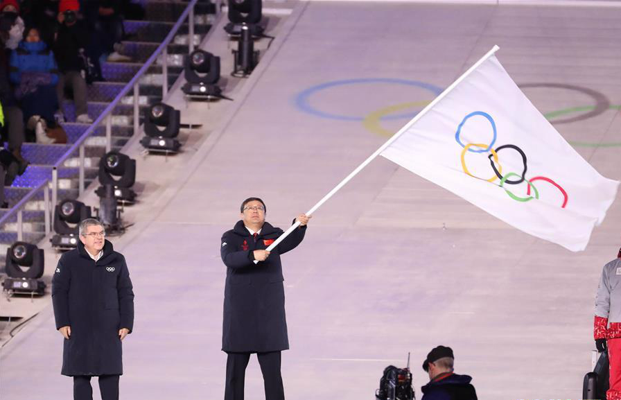 2月25日,北京市市长陈吉宁(左二)在闭幕式上挥动奥林匹克会旗。