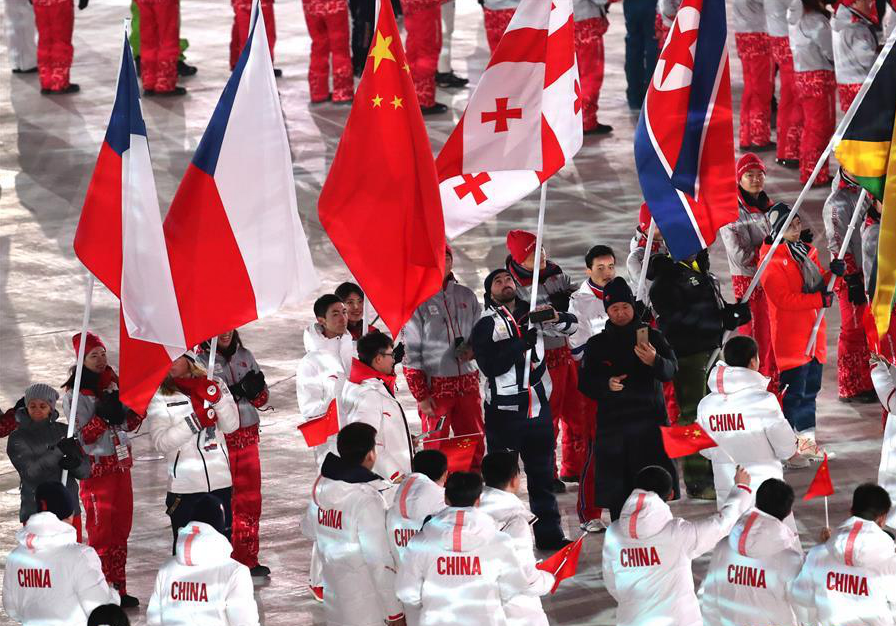 2月25日,中国代表团成员在闭幕式上入场。当日,2018年平昌冬奥会闭幕式在平昌奥林匹克体育场举行。 新华社记者李钢摄
