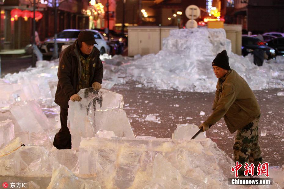 2018年2月25日,黑龙江省哈尔滨市气温回升,最高气温达到零下6℃,有些冰雪景观出现融化迹象。25日下午,中央大街开始拆除部分出现融化迹象的冰景。 张澍 摄  图片来源:东方IC