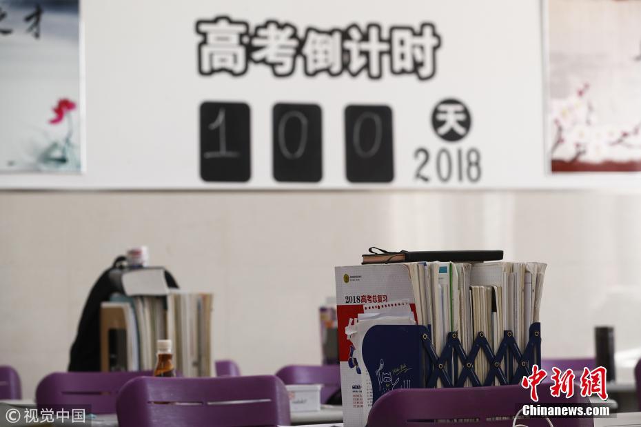 2月25日,太原,在高三年级教室内,书桌上摆放着各类学习资料及励志标语,如同图书馆。当日,山西太原某重点高中举行高考倒计时100天启动备战高考活动,不少家长到教室参观孩子的学习“阵地”为其加油鼓励。胡远嘉 摄 图片来源:视觉中国