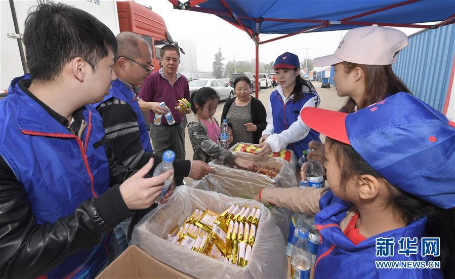 2月25日,在海口市新海港码头附近,青年志愿者们为滞留旅客提供水和食物。当日,海口秀英港、新海港和南港三港车辆大规模滞留情况持续至第8天。琼州海峡浓雾频现,能见度较低。记者从港口和交警等部门获悉,2月25日8时至17时,海口三个港口共出口44航次,出口车辆6047辆,出口旅客28565人,目前三港外道路及港内仍共有1万余车辆待渡。新华社记者 赵颖全 摄