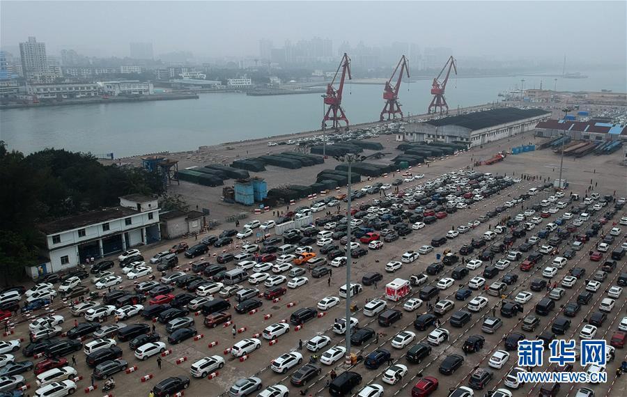2月25日,在海口市秀英港,大量车辆等待过海。当日,海口秀英港、新海港和南港三港车辆大规模滞留情况持续至第8天。琼州海峡浓雾频现,能见度较低。记者从港口和交警等部门获悉,2月25日8时至17时,海口三个港口共出口44航次,出口车辆6047辆,出口旅客28565人,目前三港外道路及港内仍共有1万余车辆待渡。新华社记者 赵颖全 摄