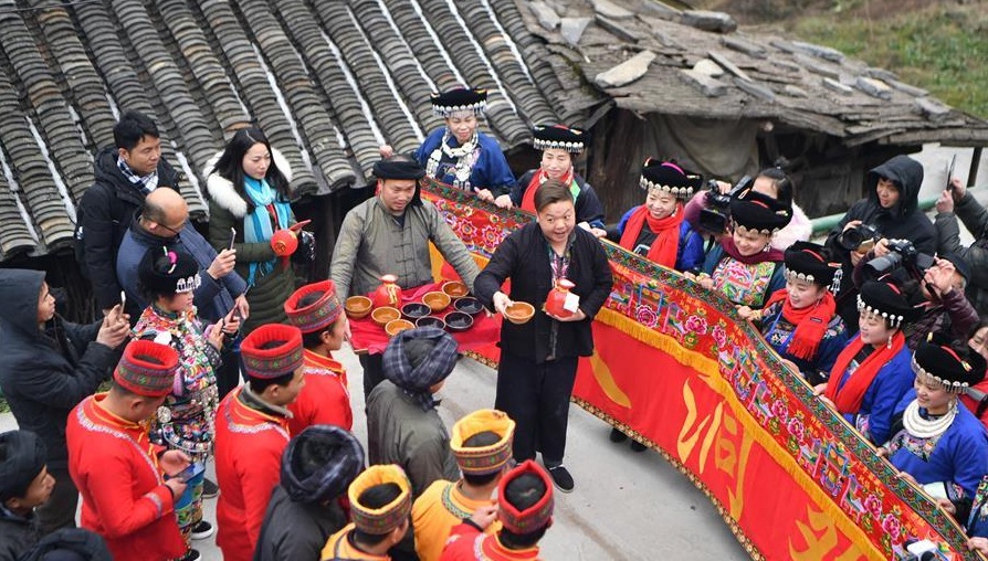 2018年2月4日,在湖南省湘西土家族苗族自治州花垣县十八洞村,新郎的迎亲队伍遇上新娘亲友拦门。新华社发(薛宇舸 摄)