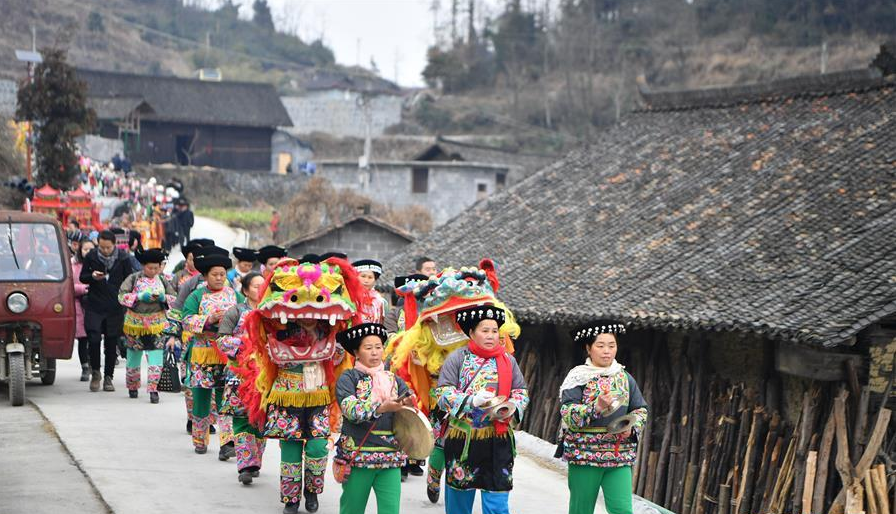 2018年全国两会,以其新的时代坐标而意义非凡——进入全面小康决胜期的中国,将以怎样的新举措落实十九大精神,开启夺取新时代中国特色社会主义伟大胜利的新征程,从“赶上时代”到“引领时代”的中国将以怎样的新姿态逐梦百年奋斗目标。又一个春天来临,又一段航程开启。以习近平新时代中国特色社会主义思想为指引,党的主张上升为国家意志,必将凝聚起13亿多中国人民的磅礴力量,向着民族复兴的伟大梦想进军!图为2018年2月4日,在湖南省湘西土家族苗族自治州花垣县十八洞村,接亲队伍在行进中。新华社发(薛宇舸 摄)