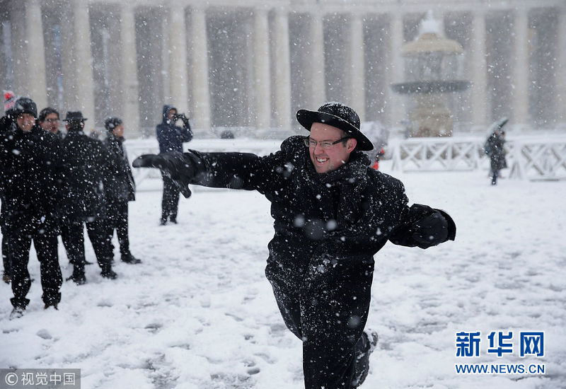 2月26日,民众在圣彼得广场打雪仗。(图片来源:视觉中国)