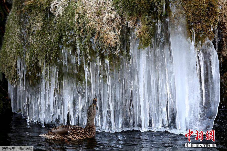 当地时间2月26日,瑞士伯尔尼的一个池塘内出现美丽的冰凌,美景也吸引了一只鸭子前来观赏。