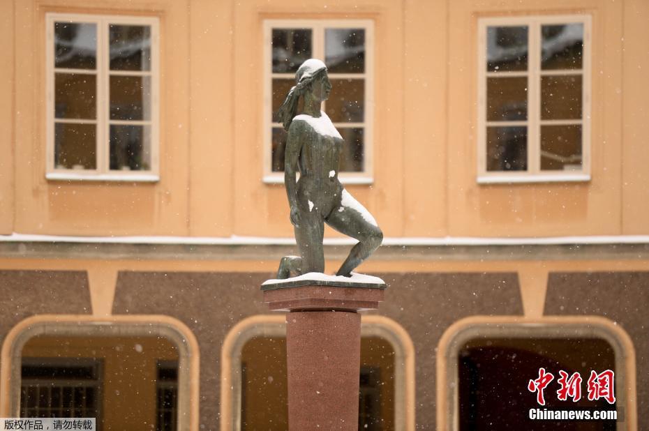 瑞典斯德哥尔摩的一尊雕塑上落满雪花。