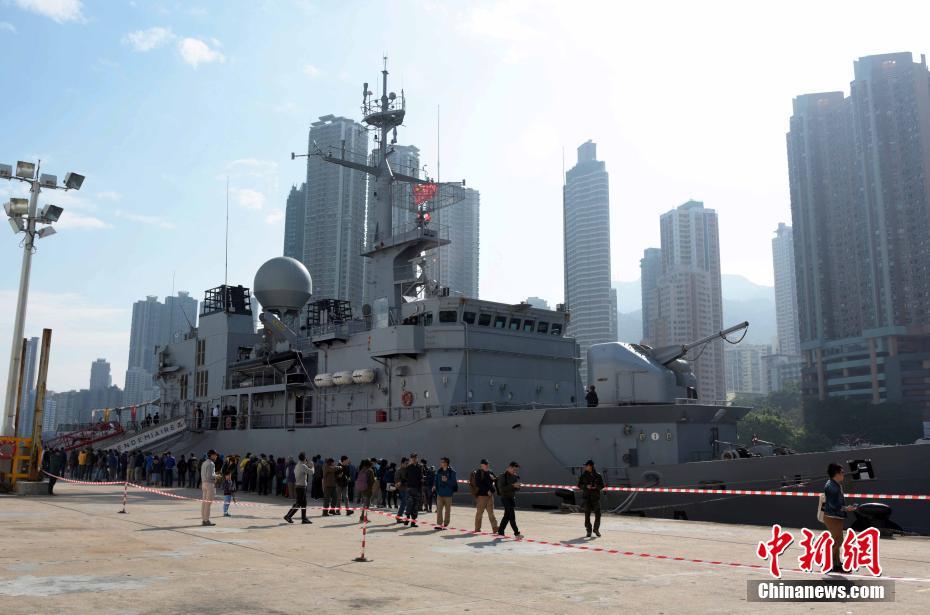 2月27日,法国海军护卫舰“葡月号”由26日起来访香港5天,停泊于香港坚尼地城招商局码头,27日起正式向公众开放参观,大批市民一早前来排队,一睹法舰风采。“葡月号”全长93.5米、宽14米,最大排水量2800吨,船员79人,全为法国人,当中女船员15人。可搭载云雀III型直升机、美洲豹直升机等,武器包括1座100毫米全自动舰炮、2座20毫米机关炮、雷达预警系统等。 中新社记者 李志华 摄