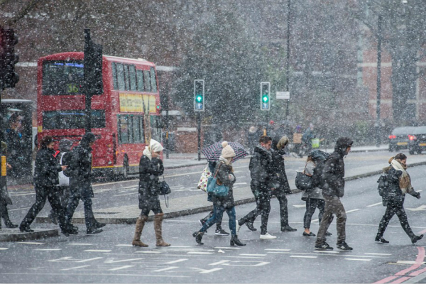 英国受寒流影响全国大面积降雪,图为伦敦市中心。