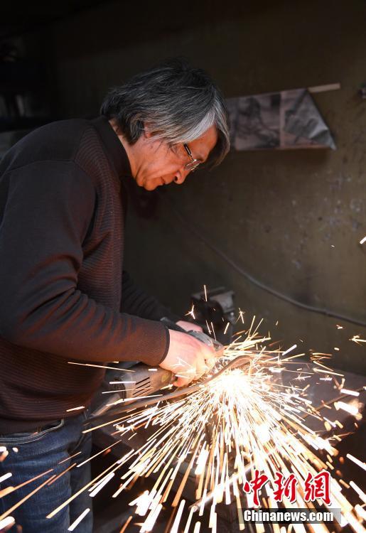 2月27日,杭州,周峰打磨废弃的材料。周峰是浙江杭州的一名装置艺术家,十多年来,他以废铜烂铁为原料,将其“重生”为艺术品。中新社记者 王刚 摄
