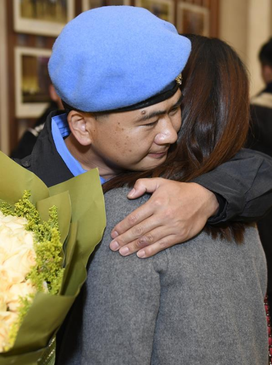中国赴南苏丹维和警队凯旋 在机场与妻子拥抱