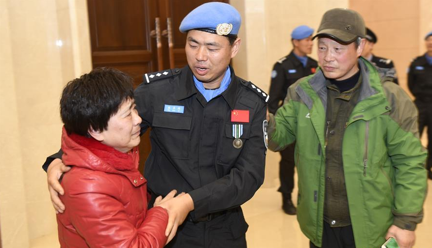 2月27日,中国第六支赴南苏丹维和警队队员韩卓琦(中)在欢迎仪式上与父母团聚。 新华社记者黄宗治摄