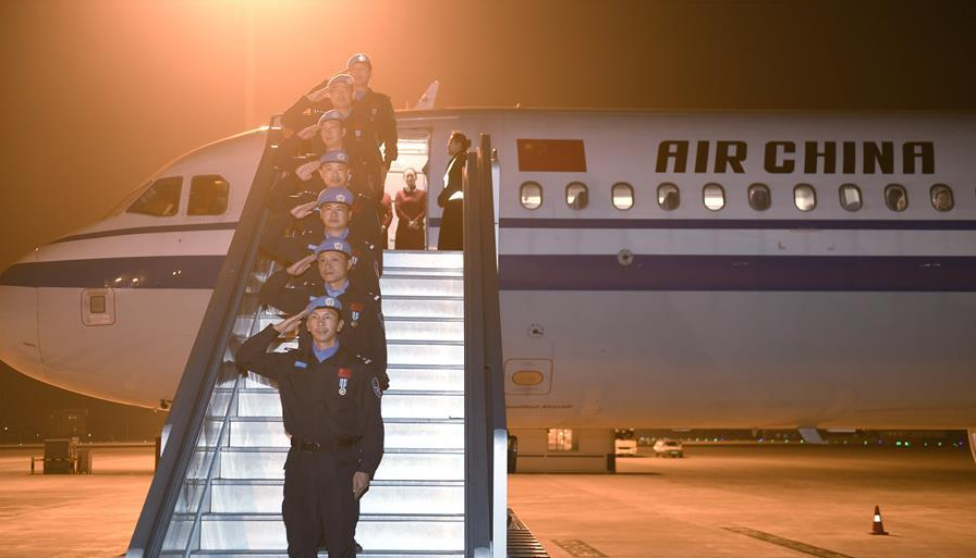 2月27日,中国第六支赴南苏丹维和警队乘机抵达杭州萧山国际机场,在下飞机后列队。当日19时23分,中国第六支赴南苏丹维和警队圆满完成为期一年的维和任务,乘机抵达杭州萧山国际机场。新华社记者黄宗治摄。