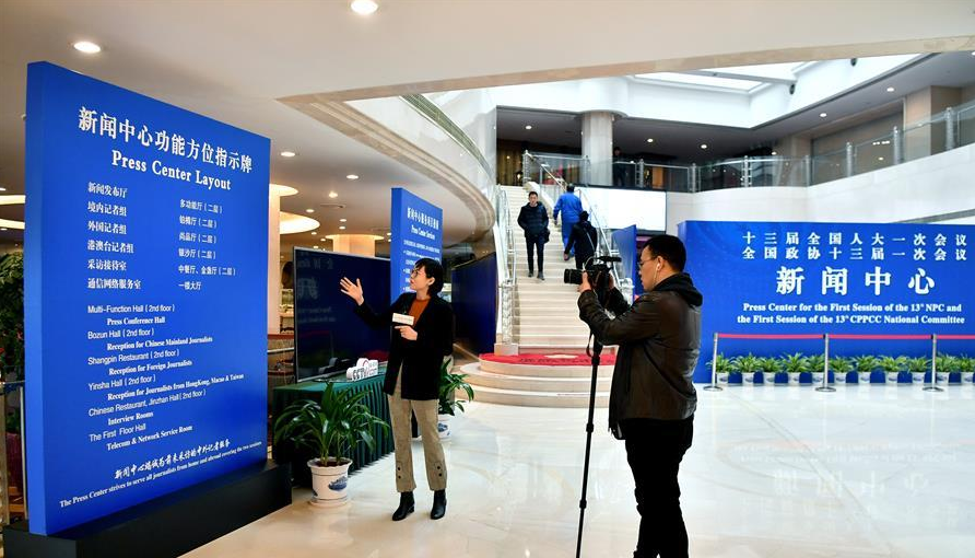 2月27日,两名记者在全国两会新闻中心内采访拍摄。当日,随着全国两会脚步的临近,设在北京西长安街北侧梅地亚中心的两会新闻中心正式“开张”。十三届全国人大一次会议和全国政协十三届一次会议将分别于3月5日和3月3日在北京开幕。新华社记者 李鑫 摄