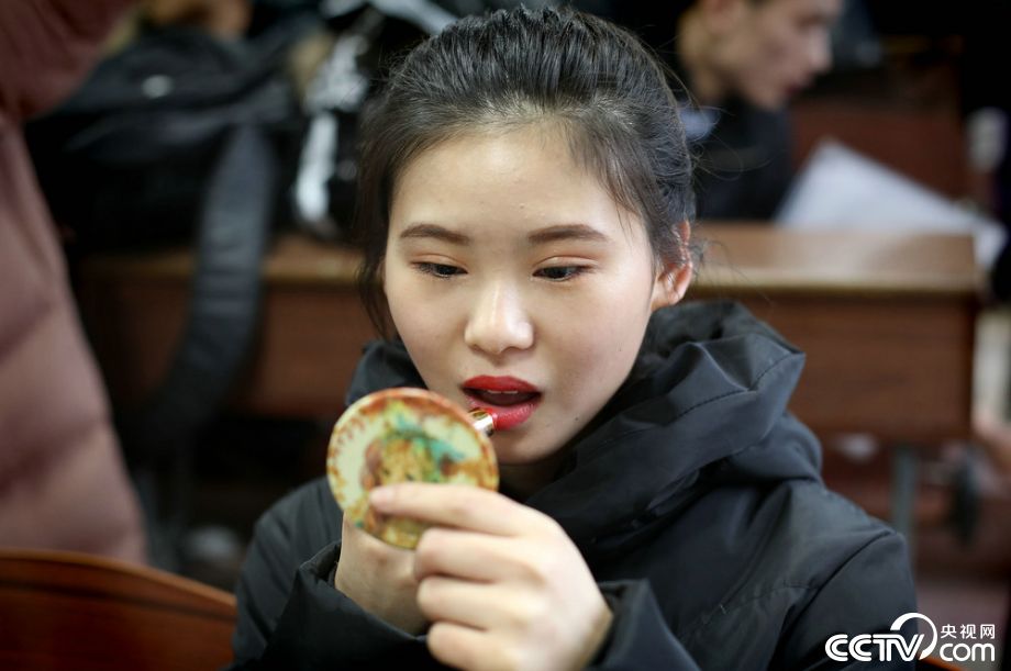 2018年2月24日,山东潍坊。进考场之前,小冉对着小镜子补妆。来源:视觉中国