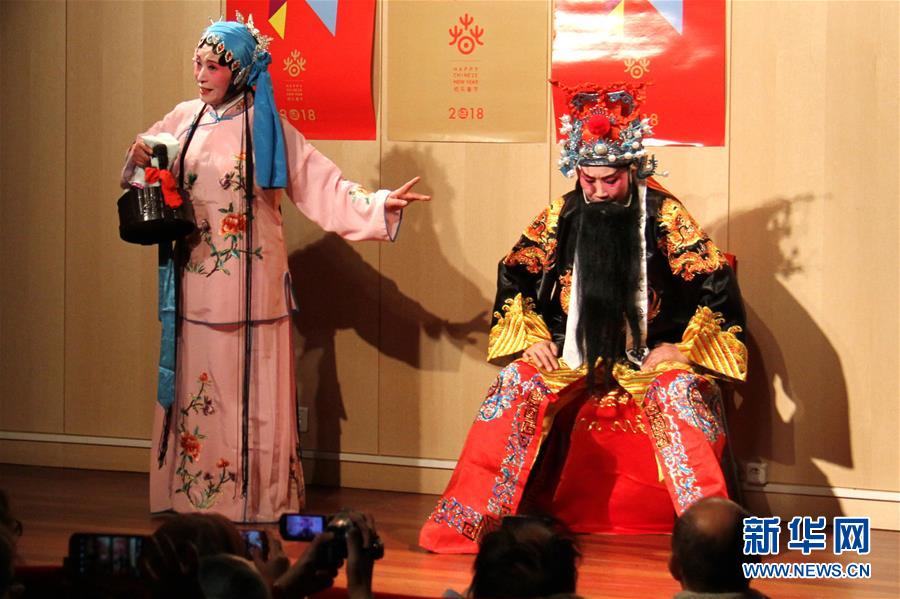 2月27日,在法国巴黎,演员表演剧目《光王私访》。中国湖北省荆门市东宝区梁山调剧团27日晚在法国塞纳河畔巴黎中国文化中心举办专场演出,以独特的唱腔和板式表演了自编剧目《光王私访》,令现场观众耳目一新。东宝梁山调属板腔系统的地方戏剧种,是中国稀有剧种之一。新华社记者张曼摄