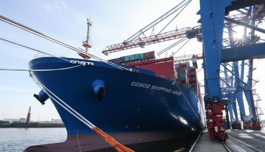 这是2月23日在德国汉堡港拍摄的集装箱船“中远海运白羊座”号。