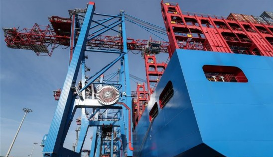 2月23日,在德国汉堡港,轨道式起重机卸载集装箱船“中远海运白羊座”号上的集装箱。
