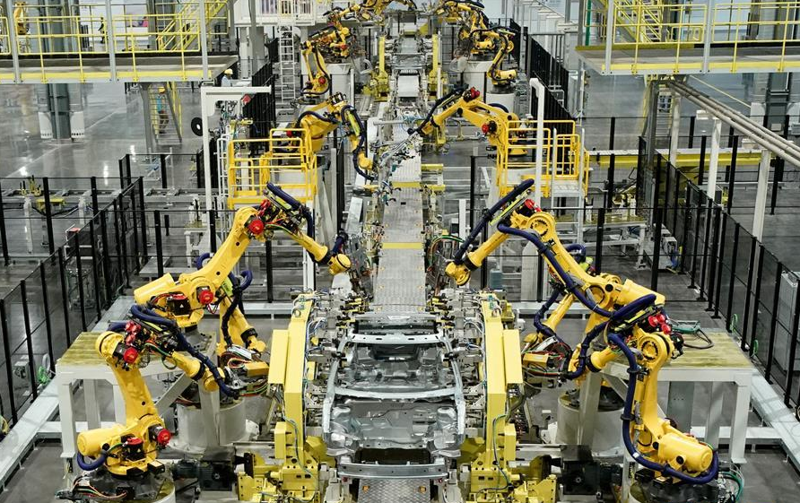 2017年12月5日,国能新能源汽车生产启动仪式在天津滨海高新区举行。这是机械手在国能新能源汽车焊接流水线上工作。新华社记者陈建力 摄