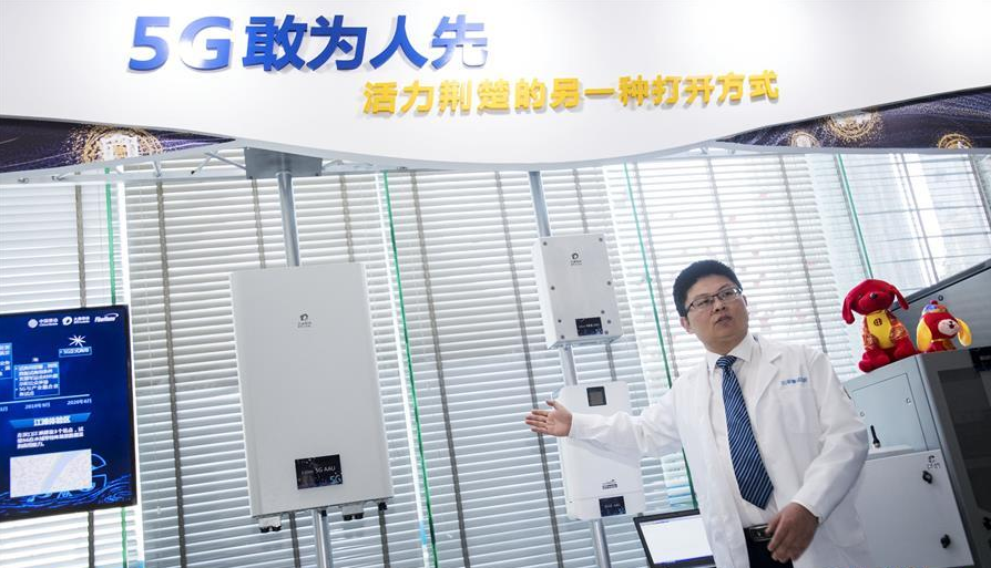 2018年2月1日,湖北首个室外5G试验基站在武汉开通,这意味着5G技术在湖北的规模组网规模试验已进入攻坚阶段。这是2月5日,工作人员介绍5G试验基站的射频单元。新华社记者熊琦 摄