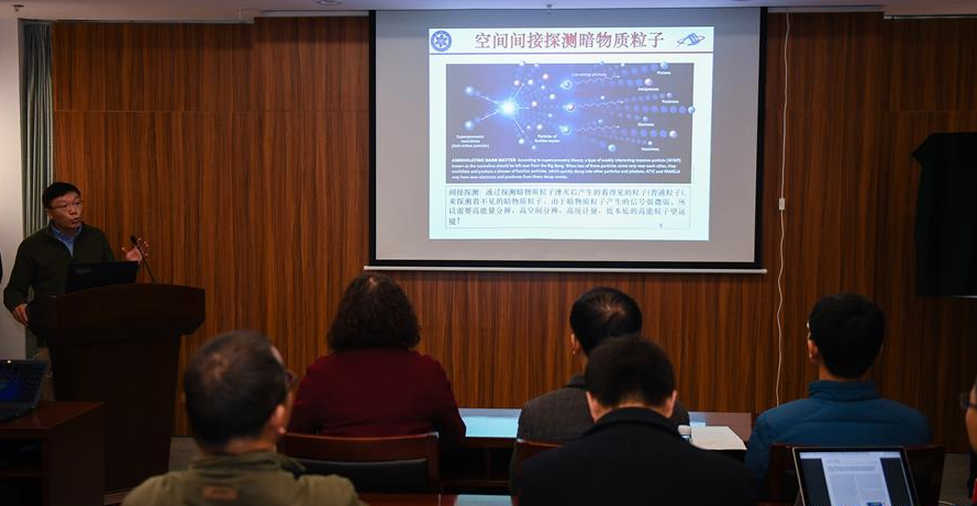 2017年11月30日,中科院紫金山天文台在江苏南京举行暗物质粒子探测卫星“悟空”首批重大科学成果报告会。这是“悟空”首席科学家、中科院紫金山天文台副台长常进在报告会上介绍相关科研成果。新华社记者李响 摄