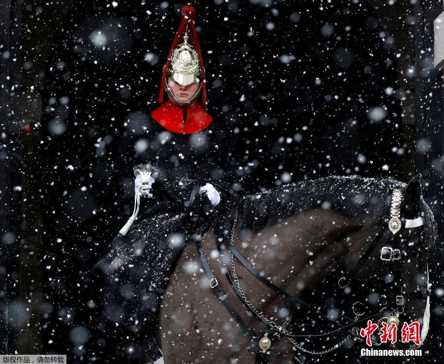 当地时间2018年2月28日,英国伦敦,英国迎来强降雪天气,皇家骑兵冒雪巡逻。近日,受来自西伯利亚冷空气的影响,英国迎来“五年来最寒冷的一周”,部分地区遭遇降雪袭击,出行交通受到影响。