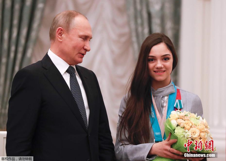 当地时间2月28日,俄罗斯总统普京在克里姆林宫为赢得奥运奖牌的46名俄罗斯运动员颁发国家奖章。据俄罗斯卫星网报道,消息人士表示,当天国际奥委会恢复了俄罗斯奥委会的成员资格,该资格在平昌冬奥会前2个月被取消。俄罗斯运动员在平昌冬奥会上共摘得2枚金牌、6枚银牌子、9枚铜牌。图为普京与平昌冬奥会花样滑冰银牌获得者梅德韦杰娃。