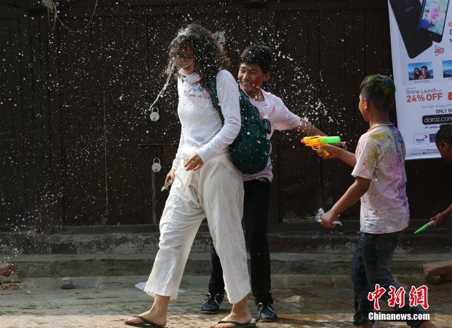 尼泊尔加德满都等地区民众在3月1日庆祝洒红节,图为加德满都一位外国游客被泼水。中新社记者 张晨翼 摄