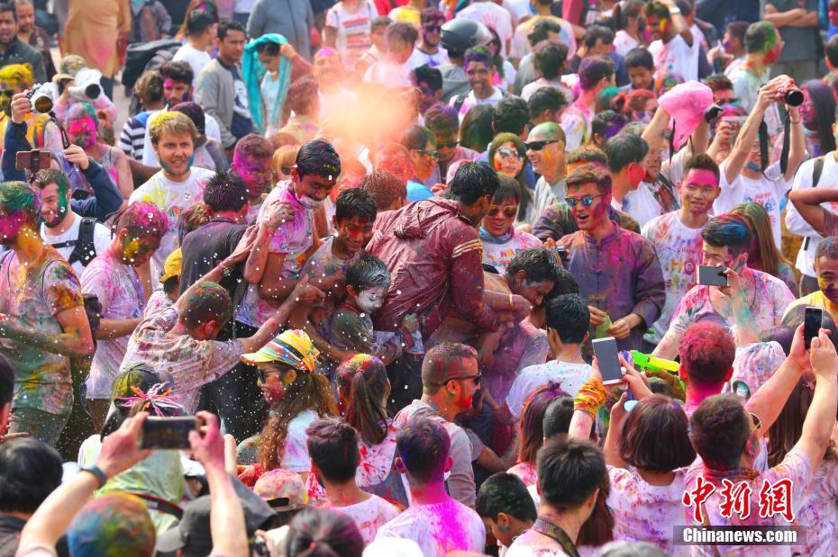 尼泊尔加德满都等地区民众在3月1日庆祝洒红节。中新社记者 张晨翼 摄