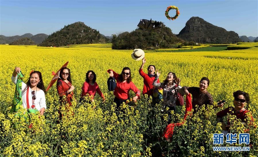 游客们在云南省罗平县的油菜花田里合影(2月28日摄)。新华社记者 蔺以光 摄