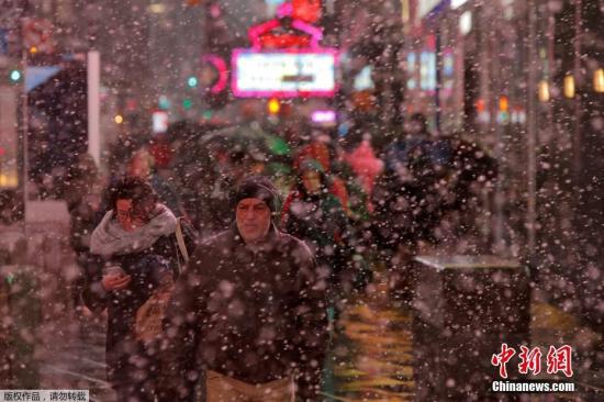 图为当地时间3月2日,纽约民众顶着风雪走在时代广场。今年1月4日,一个“炸弹气旋”袭击美国东北部地区,带来大范围暴雪。