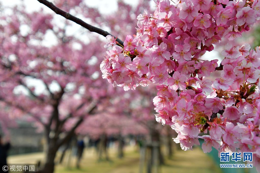 当地时间2018年3月3日,日本东京,位于东京龟户中央公园的河津樱盛开,吸引大量市民游客赏花拍照忙。(图片来源:视觉中国)