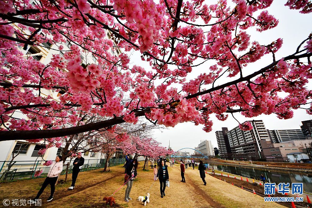 当地时间2018年3月3日,日本东京,位于东京龟户中央公园的河津樱盛开,吸引大量市民游客赏花拍照忙。(图片来源:视觉中国)