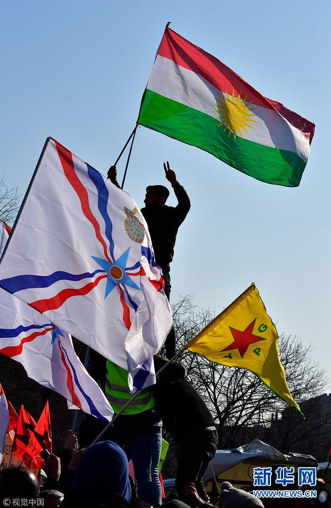 当地时间2018年3月3日,德国柏林,当地民众举行游行,抗议土耳其对叙利亚阿夫林地区的库尔德人采取军事行动。(图片来源:视觉中国)