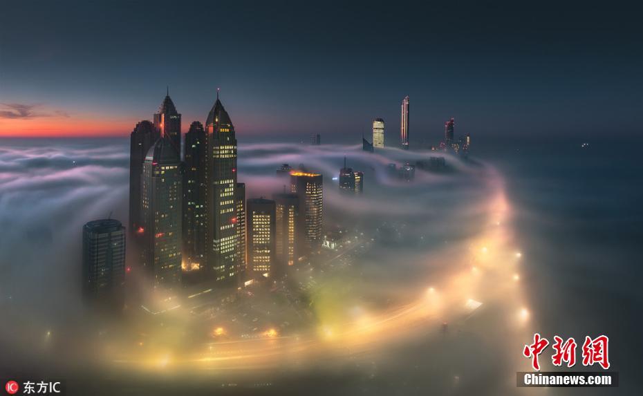 2018年3月1日报道(具体拍摄时间不详),26岁的摄影师Khalid Alhammadi在阿布扎比上空拍摄了一组迷雾中的城市美景照,画面仿若人间仙境,天外之城。他爬上了部分中东地区最高的大楼,然后拍摄被迷雾笼罩的城市地标建筑。照片中,一座座摩天大楼和清真寺塔高耸如云,在迷雾之端仿佛造出了一个全新的天空世界,美得让人窒息。图片来源:东方IC 版权作品 请勿转载