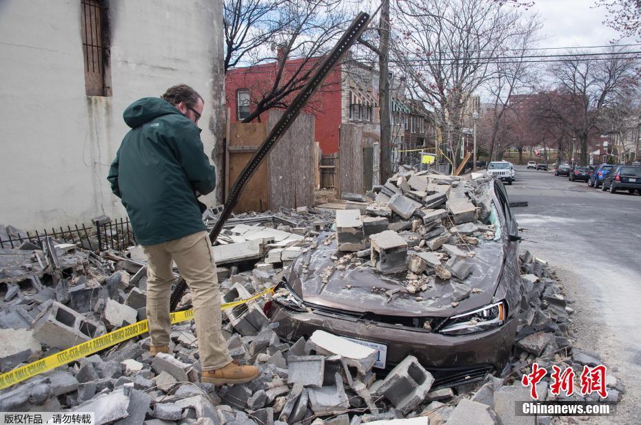 图为3月2日,美国华盛顿东北部的一座小镇,建筑外墙被大风吹落,路边停放的汽车被砖石淹没。
