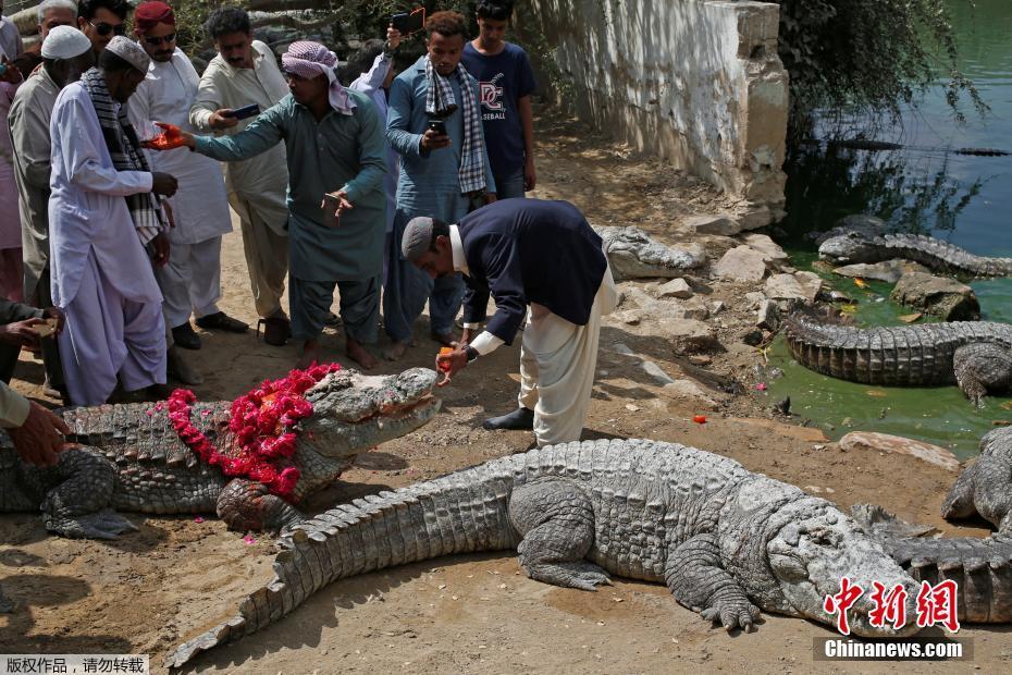 巴基斯坦人庆祝鳄鱼节 为巨鳄戴上花环