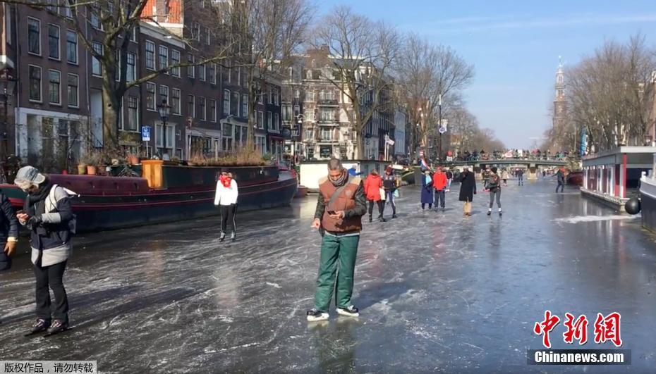 寒流致荷兰首都运河冰封 民众扎堆在河面滑冰