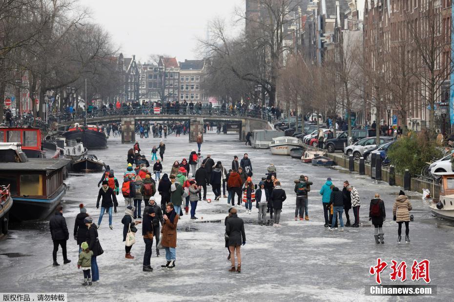 寒流致荷兰首都运河冰封 民众扎堆在河面滑冰
