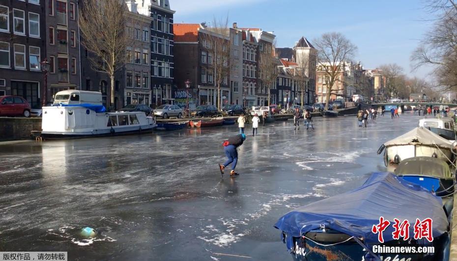 寒流致荷兰首都运河冰封 民众扎堆在河面滑冰