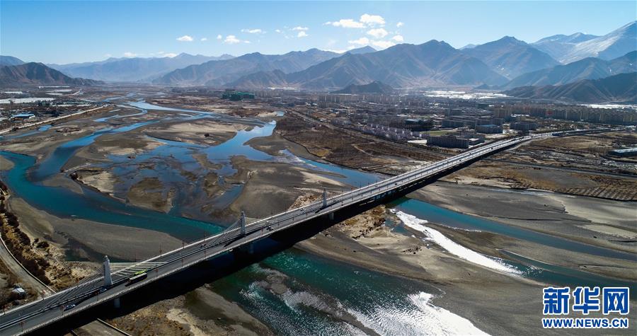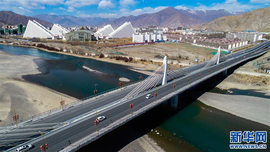 这是横跨拉萨河的新建环城路纳金大桥段(3月4日无人机拍摄)。新华社记者 晋美多吉 摄