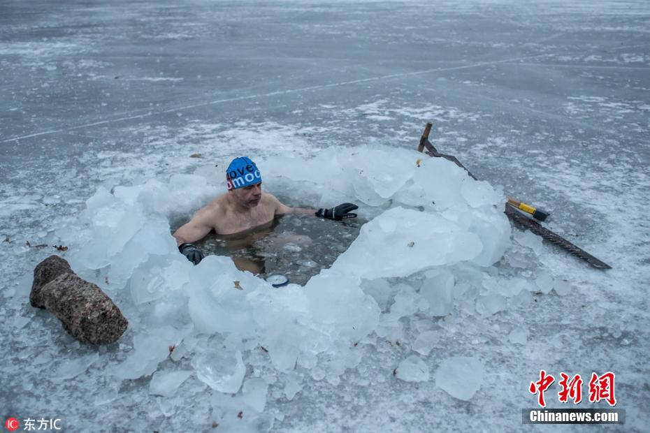 捷克男子凿穿30厘米冰层 在冰水中沐浴