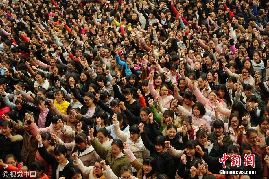 近日,河南驻马店,距2018年高考不足百日,河南省汝南高中举行高考百日誓师大会。为鼓舞高三年级全体师生的斗志,对学生进行应试心理辅导,学校邀请了某教育培训机构为该校2300名即将参加高考的高三学生进行了励志演讲。现场场面震撼,激情澎湃,斗志昂扬的高三学子纷纷走上舞台,谈梦想,表决心。在主持人的引导上,台上学生一遍遍高呼梦想的大学名字,直至让自己流下激动的泪水。台下的高三学子也振臂齐呼“上一本、上重点、进清华、上北大”等梦想口号,并有数十名高三男生走向前台现场集体做俯卧撑,为迎战高考鼓劲加油。醒目的励志标语,上千只紧握的拳头,高三学生们“坚持!坚持!坚持!……”的口号声久久地响彻整个会场。活动上,高三学子还通过鞠躬叩首的方式对多年辛苦教育他们的老师表达了拜谢感恩之意。王向阳 摄 图片来源:视觉中国