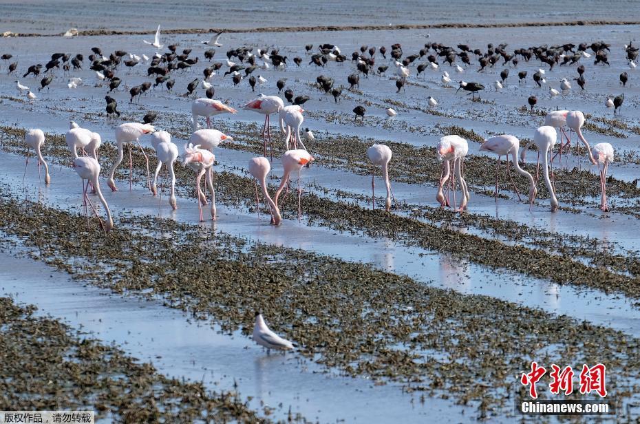 西班牙一自然保护区内大量火烈鸟觅食 场面壮观
