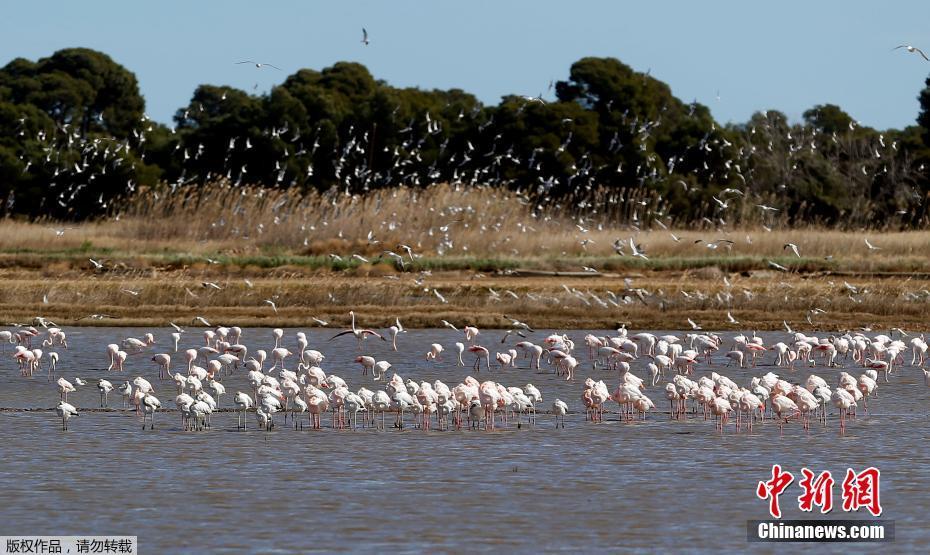 西班牙一自然保护区内大量火烈鸟觅食 场面壮观